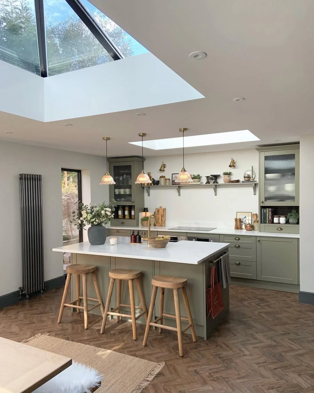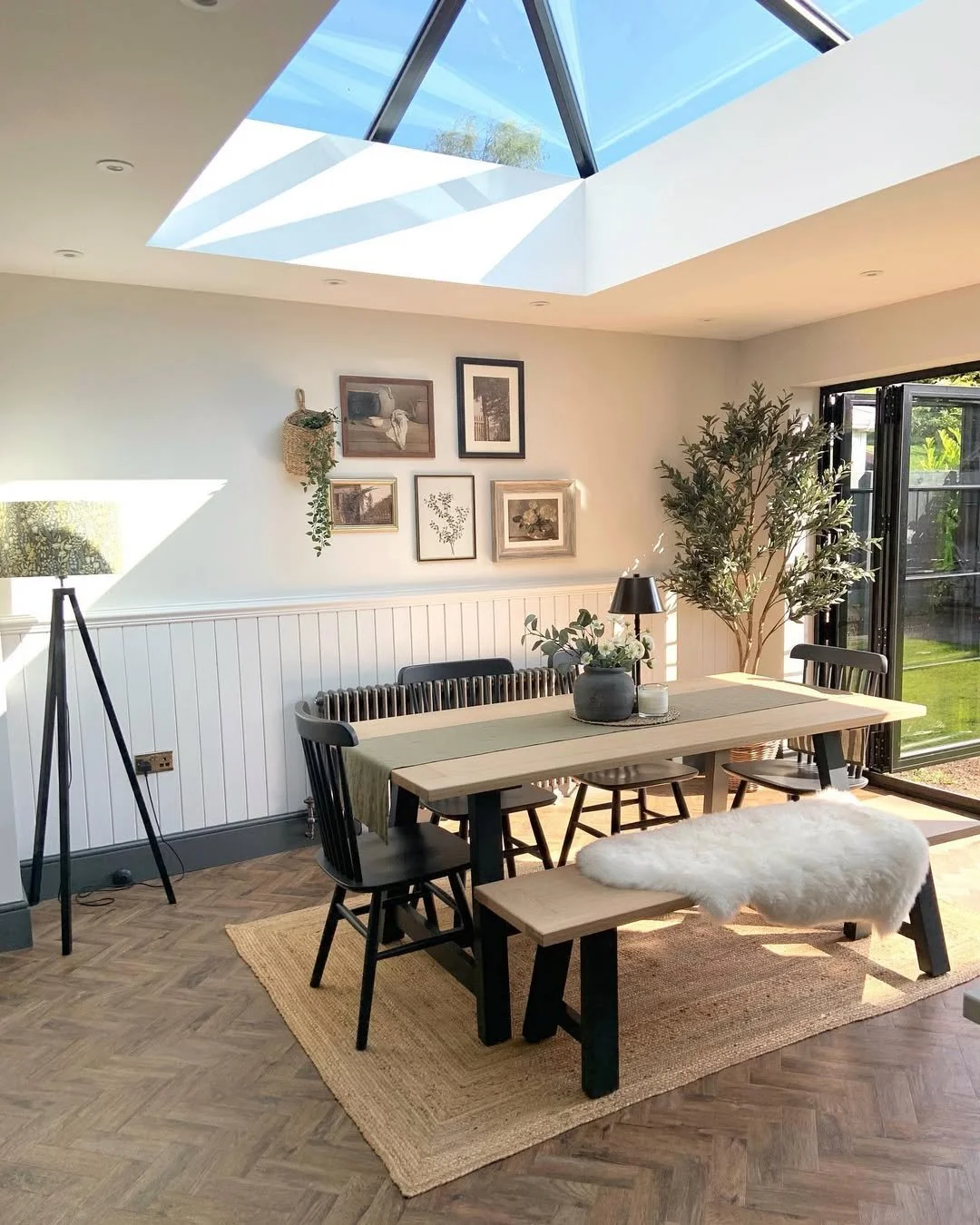 A stunning contemporary extension, seamlessly merging indoor and outdoor spaces. The open-plan layout indudes bespoke kitchen cabinetry. Underfloor heating. And biophilic design elements that enhance natural light and ventilation. The extension features sliding glass walls, allowing the living space to extend into the beautifully landscaped Garden Finishes include custom-built furniture, ambient lighting, and a fully integrated AV system.